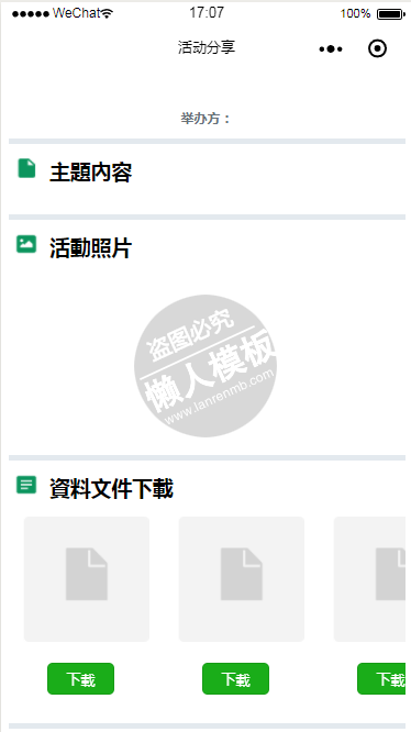模板简介:该模板名称为【微信小程序活动分享页面设计制作开发教程】,大小是,文档格式为.,推荐使用打开,作品中的图片,文字等数据均可修改,图片请在作品中选中图片替换即可,文字修改直接点击文字修改即可,您也可以新增或修改作品中的内容,该模板来自用户分享,如有侵权行为请联系网站客服处理。欢迎来懒人模板【小程序教程】栏目查找您需要的精美模板。