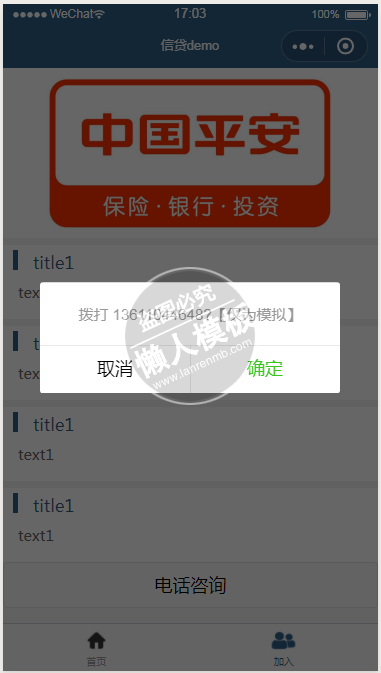 模板简介:该模板名称为【微信小程序信贷电话咨询页面设计制作开发教程】,大小是,文档格式为.,推荐使用打开,作品中的图片,文字等数据均可修改,图片请在作品中选中图片替换即可,文字修改直接点击文字修改即可,您也可以新增或修改作品中的内容,该模板来自用户分享,如有侵权行为请联系网站客服处理。欢迎来懒人模板【小程序教程】栏目查找您需要的精美模板。