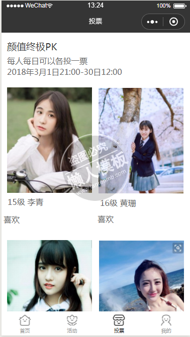 模板简介:该模板名称为【微信小程序校花投票评选图片展示页面设计制作开发教程】,大小是,文档格式为.,推荐使用打开,作品中的图片,文字等数据均可修改,图片请在作品中选中图片替换即可,文字修改直接点击文字修改即可,您也可以新增或修改作品中的内容,该模板来自用户分享,如有侵权行为请联系网站客服处理。欢迎来懒人模板【小程序教程】栏目查找您需要的精美模板。