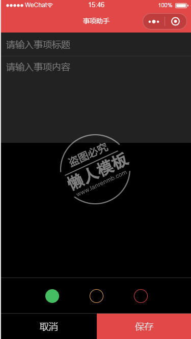 模板简介:该模板名称为【微信小程序待办事项添加页面设计制作开发教程】,大小是,文档格式为.,推荐使用打开,作品中的图片,文字等数据均可修改,图片请在作品中选中图片替换即可,文字修改直接点击文字修改即可,您也可以新增或修改作品中的内容,该模板来自用户分享,如有侵权行为请联系网站客服处理。欢迎来懒人模板【小程序教程】栏目查找您需要的精美模板。