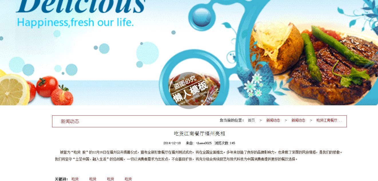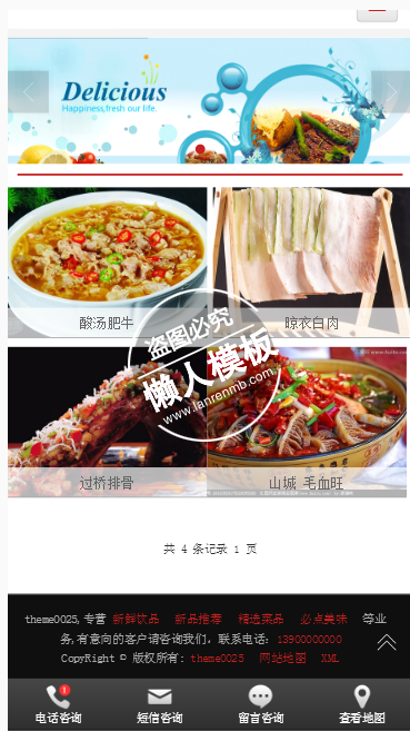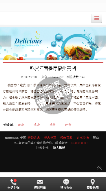 模板简介:该模板名称为【吃货江南餐厅手机PC端自适应响应式html5餐饮网站双模板下载】,大小是,文档格式为.,推荐使用打开,作品中的图片,文字等数据均可修改,图片请在作品中选中图片替换即可,文字修改直接点击文字修改即可,您也可以新增或修改作品中的内容,该模板来自用户分享,如有侵权行为请联系网站客服处理。欢迎来懒人模板【餐饮】栏目查找您需要的精美模板。