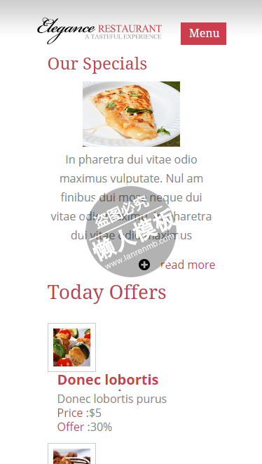 模板简介:该模板名称为【Elegance餐馆特别食物触屏版html5手机wap餐饮酒店网站模板下载】,大小是,文档格式为.,推荐使用打开,作品中的图片,文字等数据均可修改,图片请在作品中选中图片替换即可,文字修改直接点击文字修改即可,您也可以新增或修改作品中的内容,该模板来自用户分享,如有侵权行为请联系网站客服处理。欢迎来懒人模板【餐饮】栏目查找您需要的精美模板。