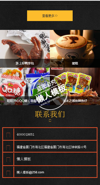 模板简介:该模板名称为【零食小屋食品专题手机PC端自适应响应式html5餐饮网站双模板下载】,大小是,文档格式为.,推荐使用打开,作品中的图片,文字等数据均可修改,图片请在作品中选中图片替换即可,文字修改直接点击文字修改即可,您也可以新增或修改作品中的内容,该模板来自用户分享,如有侵权行为请联系网站客服处理。欢迎来懒人模板【餐饮】栏目查找您需要的精美模板。