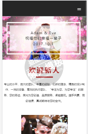 模板简介:该模板名称为【婚礼服务展示自适应响应式服务网站双模板下载】,大小是,文档格式为.,推荐使用打开,作品中的图片,文字等数据均可修改,图片请在作品中选中图片替换即可,文字修改直接点击文字修改即可,您也可以新增或修改作品中的内容,该模板来自用户分享,如有侵权行为请联系网站客服处理。欢迎来懒人模板【婚庆】栏目查找您需要的精美模板。