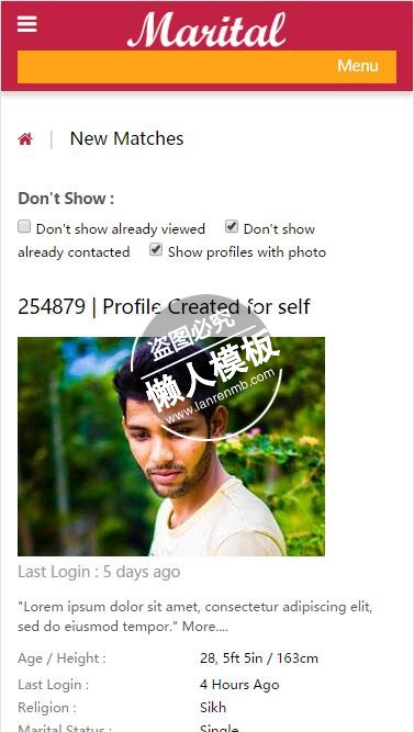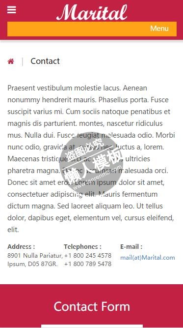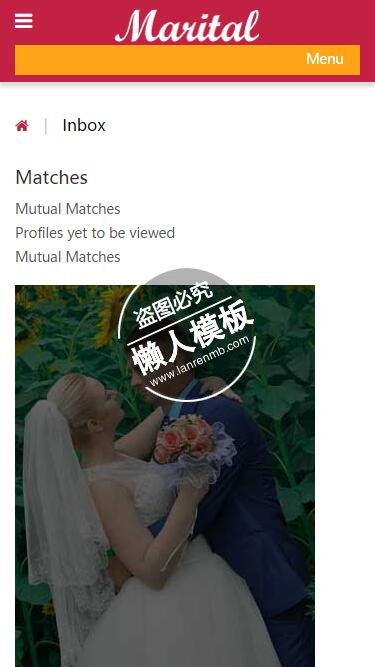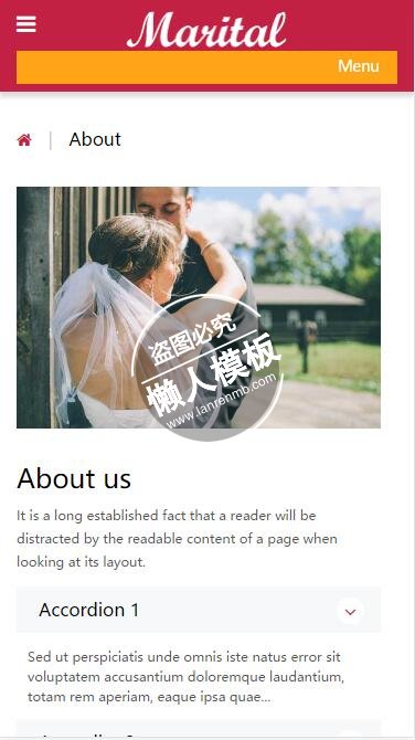模板简介:该模板名称为【Marital婚礼双方介绍html5婚庆公司手机wap网站模板免费下载】,大小是,文档格式为.,推荐使用打开,作品中的图片,文字等数据均可修改,图片请在作品中选中图片替换即可,文字修改直接点击文字修改即可,您也可以新增或修改作品中的内容,该模板来自用户分享,如有侵权行为请联系网站客服处理。欢迎来懒人模板【婚庆】栏目查找您需要的精美模板。