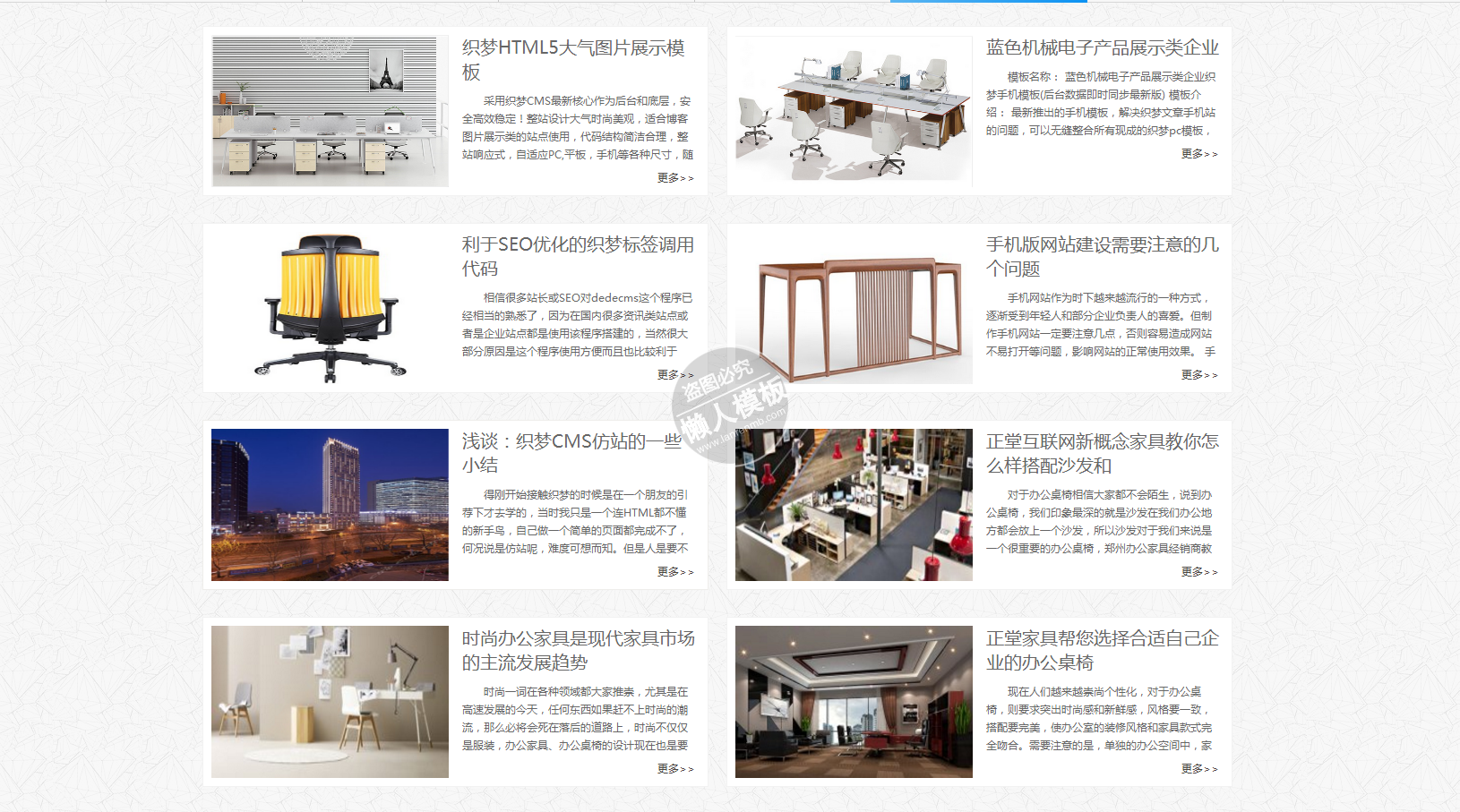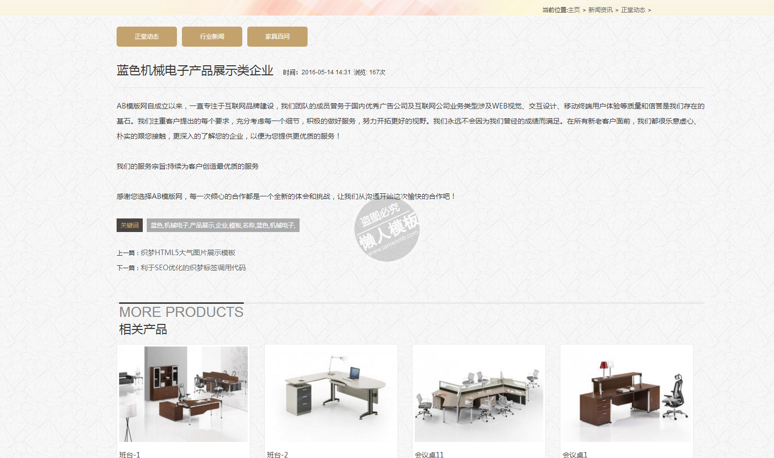 模板简介:该模板名称为【正堂家具办公家具桌椅班台类企业整站带织梦后台pc网站源码下载】,大小是,文档格式为.,推荐使用打开,作品中的图片,文字等数据均可修改,图片请在作品中选中图片替换即可,文字修改直接点击文字修改即可,您也可以新增或修改作品中的内容,该模板来自用户分享,如有侵权行为请联系网站客服处理。欢迎来懒人模板【家居】栏目查找您需要的精美模板。