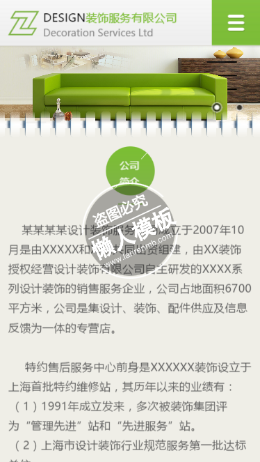 模板简介:该模板名称为【DESIGN装饰服务有限公司手机wap智能家居设计网站模板免费下载】,大小是,文档格式为.,推荐使用打开,作品中的图片,文字等数据均可修改,图片请在作品中选中图片替换即可,文字修改直接点击文字修改即可,您也可以新增或修改作品中的内容,该模板来自用户分享,如有侵权行为请联系网站客服处理。欢迎来懒人模板【家居】栏目查找您需要的精美模板。