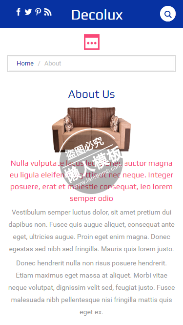 模板简介:该模板名称为【Decolux蓝粉色风格html5手机wap家居设计家具网站模板免费下载】,大小是,文档格式为.,推荐使用打开,作品中的图片,文字等数据均可修改,图片请在作品中选中图片替换即可,文字修改直接点击文字修改即可,您也可以新增或修改作品中的内容,该模板来自用户分享,如有侵权行为请联系网站客服处理。欢迎来懒人模板【家居】栏目查找您需要的精美模板。
