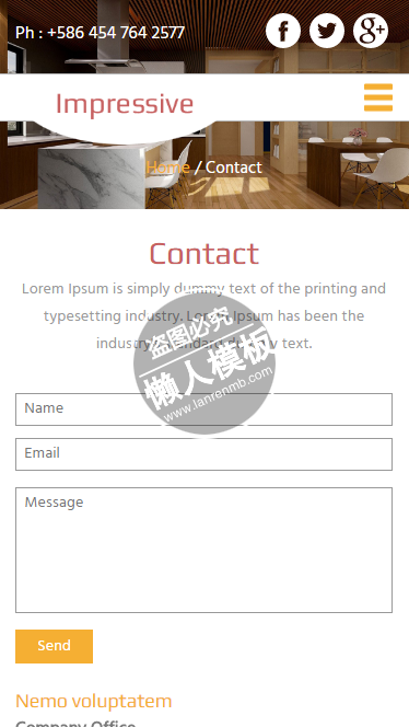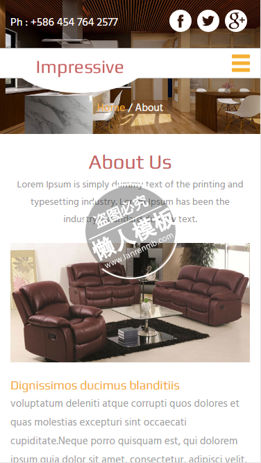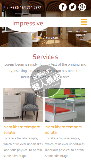 模板简介:该模板名称为【Impressive宽敞华丽装饰html5家居设计家具手机网站模板免费下载】,大小是,文档格式为.,推荐使用打开,作品中的图片,文字等数据均可修改,图片请在作品中选中图片替换即可,文字修改直接点击文字修改即可,您也可以新增或修改作品中的内容,该模板来自用户分享,如有侵权行为请联系网站客服处理。欢迎来懒人模板【家居】栏目查找您需要的精美模板。