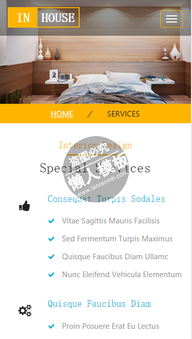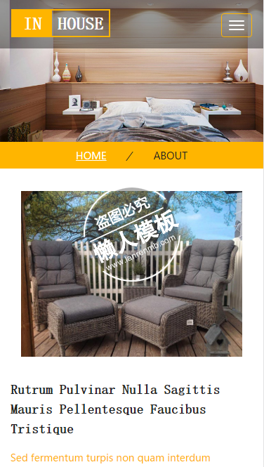 模板简介:该模板名称为【In House室内舒适设计html5家居设计家具手机网站模板免费下载】,大小是,文档格式为.,推荐使用打开,作品中的图片,文字等数据均可修改,图片请在作品中选中图片替换即可,文字修改直接点击文字修改即可,您也可以新增或修改作品中的内容,该模板来自用户分享,如有侵权行为请联系网站客服处理。欢迎来懒人模板【家居】栏目查找您需要的精美模板。