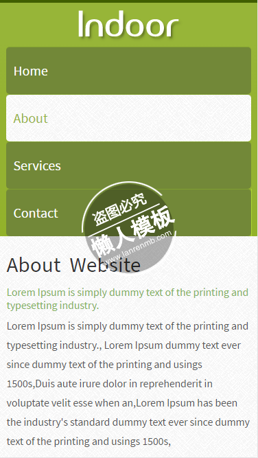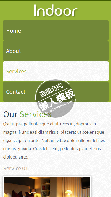 模板简介:该模板名称为【Indoor绿色字体风格html5家居设计家具手机wap网站模板免费下载】,大小是,文档格式为.,推荐使用打开,作品中的图片,文字等数据均可修改,图片请在作品中选中图片替换即可,文字修改直接点击文字修改即可,您也可以新增或修改作品中的内容,该模板来自用户分享,如有侵权行为请联系网站客服处理。欢迎来懒人模板【家居】栏目查找您需要的精美模板。