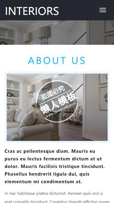 模板简介:该模板名称为【Interiors动态效果切换html5家居设计家具手机网站模板免费下载】,大小是,文档格式为.,推荐使用打开,作品中的图片,文字等数据均可修改,图片请在作品中选中图片替换即可,文字修改直接点击文字修改即可,您也可以新增或修改作品中的内容,该模板来自用户分享,如有侵权行为请联系网站客服处理。欢迎来懒人模板【家居】栏目查找您需要的精美模板。