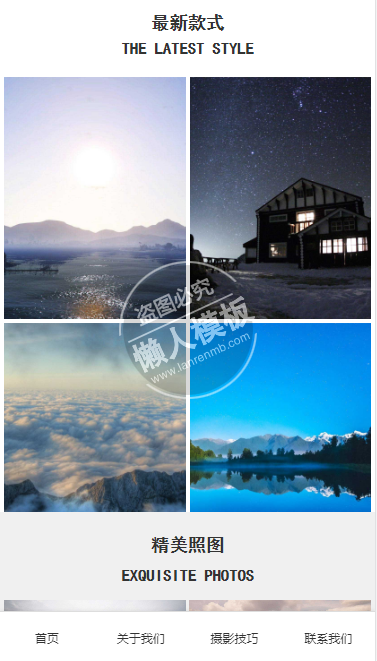 模板简介:该模板名称为【PHOTO CAMERA自适应响应式摄影网站双模板下载】,大小是,文档格式为.,推荐使用打开,作品中的图片,文字等数据均可修改,图片请在作品中选中图片替换即可,文字修改直接点击文字修改即可,您也可以新增或修改作品中的内容,该模板来自用户分享,如有侵权行为请联系网站客服处理。欢迎来懒人模板【摄影】栏目查找您需要的精美模板。