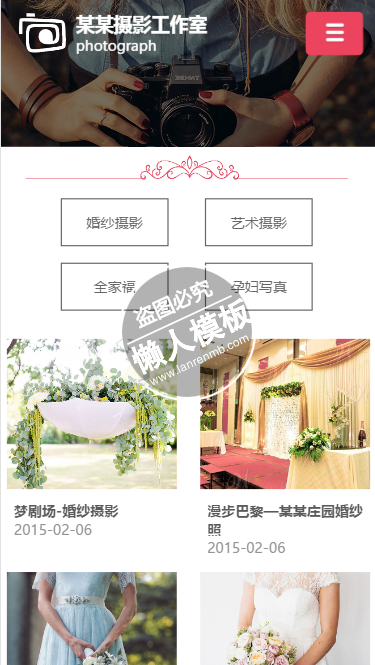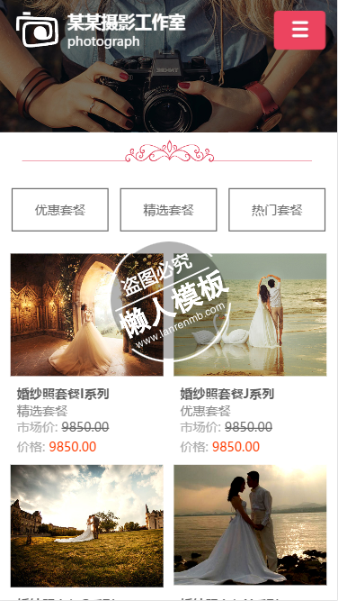 模板简介:该模板名称为【婚纱摄影团队触屏版手机wap摄影网站模板免费下载】,大小是,文档格式为.,推荐使用打开,作品中的图片,文字等数据均可修改,图片请在作品中选中图片替换即可,文字修改直接点击文字修改即可,您也可以新增或修改作品中的内容,该模板来自用户分享,如有侵权行为请联系网站客服处理。欢迎来懒人模板【摄影】栏目查找您需要的精美模板。