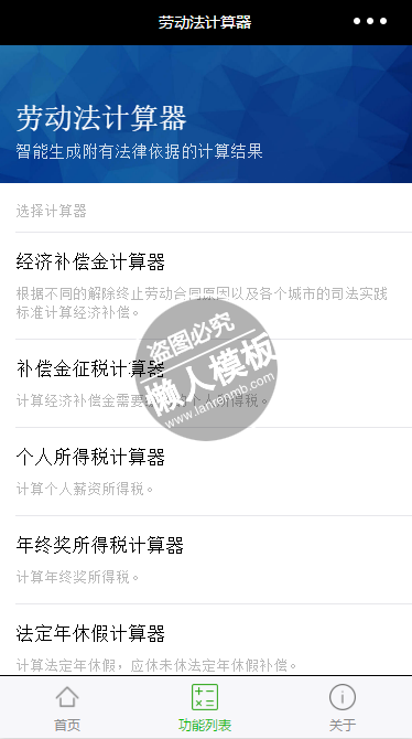 模板简介:该模板名称为【劳动法计算器小程序】,大小是,文档格式为.,推荐使用打开,作品中的图片,文字等数据均可修改,图片请在作品中选中图片替换即可,文字修改直接点击文字修改即可,您也可以新增或修改作品中的内容,该模板来自用户分享,如有侵权行为请联系网站客服处理。欢迎来懒人模板【工具】栏目查找您需要的精美模板。
