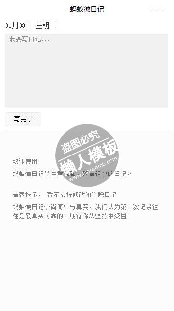 模板简介:该模板名称为【蚂蚁微日记小程序】,大小是,文档格式为.,推荐使用打开,作品中的图片,文字等数据均可修改,图片请在作品中选中图片替换即可,文字修改直接点击文字修改即可,您也可以新增或修改作品中的内容,该模板来自用户分享,如有侵权行为请联系网站客服处理。欢迎来懒人模板【工具】栏目查找您需要的精美模板。