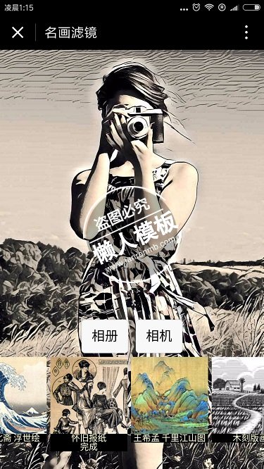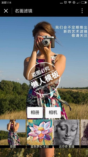 模板简介:该模板名称为【名画滤镜小程序】,大小是,文档格式为.,推荐使用打开,作品中的图片,文字等数据均可修改,图片请在作品中选中图片替换即可,文字修改直接点击文字修改即可,您也可以新增或修改作品中的内容,该模板来自用户分享,如有侵权行为请联系网站客服处理。欢迎来懒人模板【工具】栏目查找您需要的精美模板。