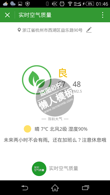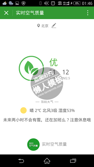 模板简介:该模板名称为【实时空气质量小程序】,大小是,文档格式为.,推荐使用打开,作品中的图片,文字等数据均可修改,图片请在作品中选中图片替换即可,文字修改直接点击文字修改即可,您也可以新增或修改作品中的内容,该模板来自用户分享,如有侵权行为请联系网站客服处理。欢迎来懒人模板【工具】栏目查找您需要的精美模板。