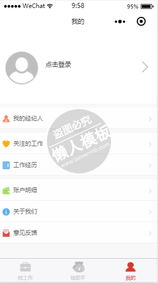 模板简介:该模板名称为【微信小程序全球英才招聘网站demo源码下载】,大小是,文档格式为.,推荐使用打开,作品中的图片,文字等数据均可修改,图片请在作品中选中图片替换即可,文字修改直接点击文字修改即可,您也可以新增或修改作品中的内容,该模板来自用户分享,如有侵权行为请联系网站客服处理。欢迎来懒人模板【其他类别】栏目查找您需要的精美模板。