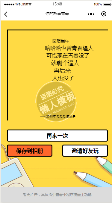 模板简介:该模板名称为【创作有毒故事微信小程序模板源码免费下载】,大小是,文档格式为.,推荐使用打开,作品中的图片,文字等数据均可修改,图片请在作品中选中图片替换即可,文字修改直接点击文字修改即可,您也可以新增或修改作品中的内容,该模板来自用户分享,如有侵权行为请联系网站客服处理。欢迎来懒人模板【其他类别】栏目查找您需要的精美模板。