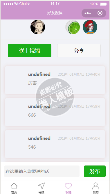 模板简介:该模板名称为【微信小程序紫色梦幻婚礼季demo源码下载】,大小是,文档格式为.,推荐使用打开,作品中的图片,文字等数据均可修改,图片请在作品中选中图片替换即可,文字修改直接点击文字修改即可,您也可以新增或修改作品中的内容,该模板来自用户分享,如有侵权行为请联系网站客服处理。欢迎来懒人模板【生活购物】栏目查找您需要的精美模板。