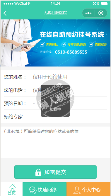 模板简介:该模板名称为【微信小程序无锡肛肠医院demo源码下载】,大小是,文档格式为.,推荐使用打开,作品中的图片,文字等数据均可修改,图片请在作品中选中图片替换即可,文字修改直接点击文字修改即可,您也可以新增或修改作品中的内容,该模板来自用户分享,如有侵权行为请联系网站客服处理。欢迎来懒人模板【生活购物】栏目查找您需要的精美模板。