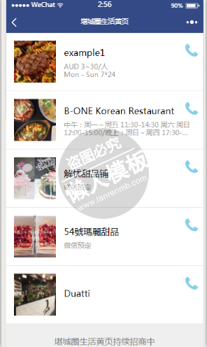 模板简介:该模板名称为【微信小程序堪城圈生活黄页demo源码下载】,大小是,文档格式为.,推荐使用打开,作品中的图片,文字等数据均可修改,图片请在作品中选中图片替换即可,文字修改直接点击文字修改即可,您也可以新增或修改作品中的内容,该模板来自用户分享,如有侵权行为请联系网站客服处理。欢迎来懒人模板【生活购物】栏目查找您需要的精美模板。