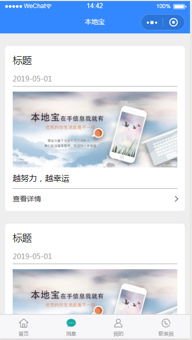 模板简介:该模板名称为【本地宝微信小程序模板源码免费下载】,大小是,文档格式为.,推荐使用打开,作品中的图片,文字等数据均可修改,图片请在作品中选中图片替换即可,文字修改直接点击文字修改即可,您也可以新增或修改作品中的内容,该模板来自用户分享,如有侵权行为请联系网站客服处理。欢迎来懒人模板【生活购物】栏目查找您需要的精美模板。