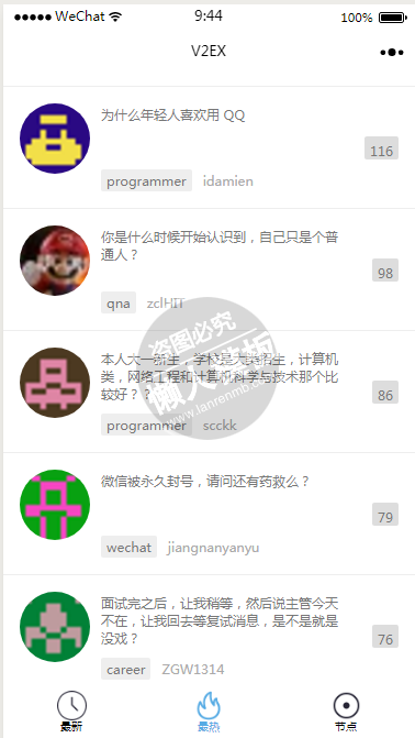 模板简介:该模板名称为【微信小程序V2EX在线社区demo源码下载】,大小是,文档格式为.,推荐使用打开,作品中的图片,文字等数据均可修改,图片请在作品中选中图片替换即可,文字修改直接点击文字修改即可,您也可以新增或修改作品中的内容,该模板来自用户分享,如有侵权行为请联系网站客服处理。欢迎来懒人模板【社区交友】栏目查找您需要的精美模板。