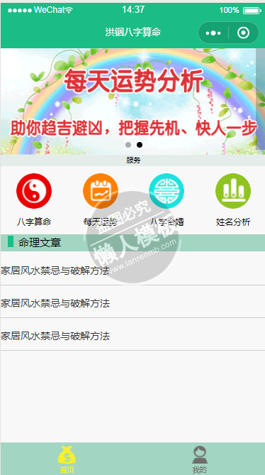 模板简介:该模板名称为【微信小程序洪铟八字算命demo完整源码下载】,大小是,文档格式为.,推荐使用打开,作品中的图片,文字等数据均可修改,图片请在作品中选中图片替换即可,文字修改直接点击文字修改即可,您也可以新增或修改作品中的内容,该模板来自用户分享,如有侵权行为请联系网站客服处理。欢迎来懒人模板【影音娱乐】栏目查找您需要的精美模板。