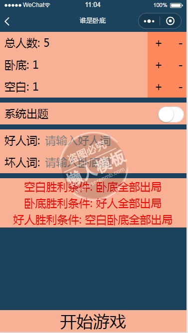模板简介:该模板名称为【微信小程序谁是卧底小游戏demo完整源码下载】,大小是,文档格式为.,推荐使用打开,作品中的图片,文字等数据均可修改,图片请在作品中选中图片替换即可,文字修改直接点击文字修改即可,您也可以新增或修改作品中的内容,该模板来自用户分享,如有侵权行为请联系网站客服处理。欢迎来懒人模板【影音娱乐】栏目查找您需要的精美模板。