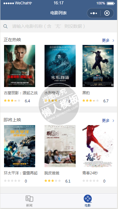 模板简介:该模板名称为【微信小程序电影速递demo源码下载】,大小是,文档格式为.,推荐使用打开,作品中的图片,文字等数据均可修改,图片请在作品中选中图片替换即可,文字修改直接点击文字修改即可,您也可以新增或修改作品中的内容,该模板来自用户分享,如有侵权行为请联系网站客服处理。欢迎来懒人模板【影音娱乐】栏目查找您需要的精美模板。