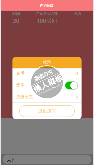 模板简介:该模板名称为【微信小程序你画我猜娱乐demo完整源码下载】,大小是,文档格式为.,推荐使用打开,作品中的图片,文字等数据均可修改,图片请在作品中选中图片替换即可,文字修改直接点击文字修改即可,您也可以新增或修改作品中的内容,该模板来自用户分享,如有侵权行为请联系网站客服处理。欢迎来懒人模板【影音娱乐】栏目查找您需要的精美模板。
