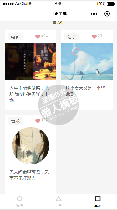模板简介:该模板名称为【微信小程序经典电影书籍语录demo源码下载】,大小是,文档格式为.,推荐使用打开,作品中的图片,文字等数据均可修改,图片请在作品中选中图片替换即可,文字修改直接点击文字修改即可,您也可以新增或修改作品中的内容,该模板来自用户分享,如有侵权行为请联系网站客服处理。欢迎来懒人模板【资讯阅读】栏目查找您需要的精美模板。