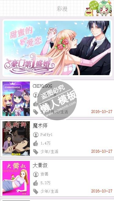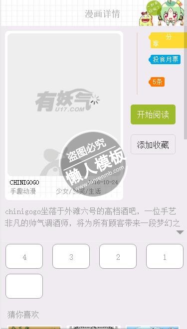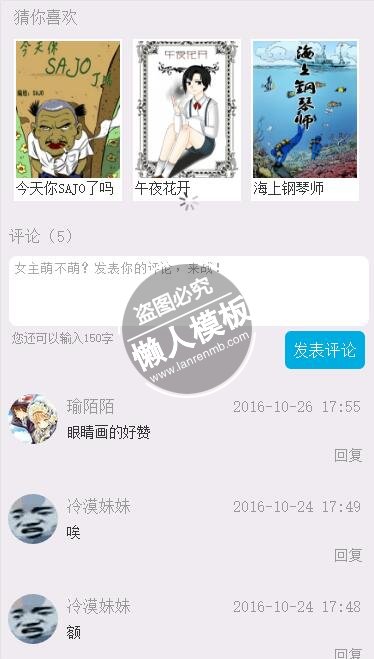 模板简介:该模板名称为【有妖气原创触屏版自适应手机wap漫画网站模板下载】,大小是,文档格式为.,推荐使用打开,作品中的图片,文字等数据均可修改,图片请在作品中选中图片替换即可,文字修改直接点击文字修改即可,您也可以新增或修改作品中的内容,该模板来自用户分享,如有侵权行为请联系网站客服处理。欢迎来懒人模板【动漫】栏目查找您需要的精美模板。