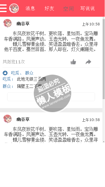 模板简介:该模板名称为【幽谷草个人空间触屏版自适应手机wap网站模板源码下载】,大小是,文档格式为.,推荐使用打开,作品中的图片,文字等数据均可修改,图片请在作品中选中图片替换即可,文字修改直接点击文字修改即可,您也可以新增或修改作品中的内容,该模板来自用户分享,如有侵权行为请联系网站客服处理。欢迎来懒人模板【交友】栏目查找您需要的精美模板。