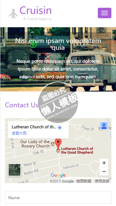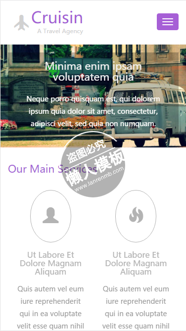 模板简介:该模板名称为【Cruisin Travel Agency html5手机旅行社旅游网站模板免费下载】,大小是,文档格式为.,推荐使用打开,作品中的图片,文字等数据均可修改,图片请在作品中选中图片替换即可,文字修改直接点击文字修改即可,您也可以新增或修改作品中的内容,该模板来自用户分享,如有侵权行为请联系网站客服处理。欢迎来懒人模板【旅游】栏目查找您需要的精美模板。