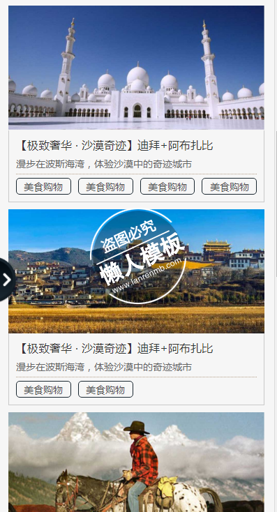 模板简介:该模板名称为【优加旅行官网html5旅行社旅游手机网站模板免费下载】,大小是,文档格式为.,推荐使用打开,作品中的图片,文字等数据均可修改,图片请在作品中选中图片替换即可,文字修改直接点击文字修改即可,您也可以新增或修改作品中的内容,该模板来自用户分享,如有侵权行为请联系网站客服处理。欢迎来懒人模板【旅游】栏目查找您需要的精美模板。