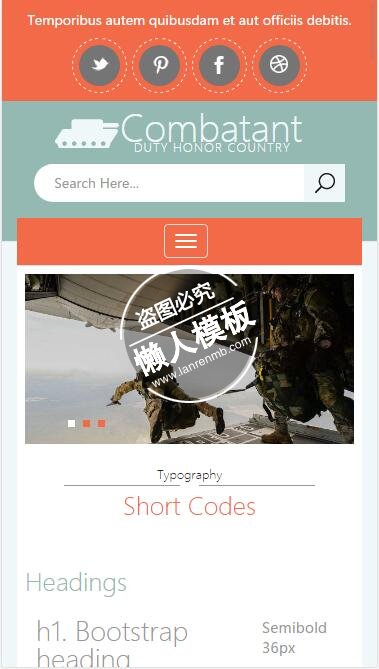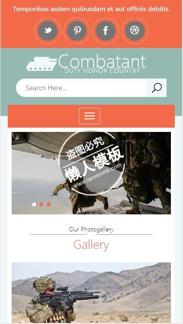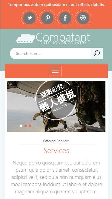 模板简介:该模板名称为【Combatant军事演练新闻html5手机wap社交网站模板免费下载】,大小是,文档格式为.,推荐使用打开,作品中的图片,文字等数据均可修改,图片请在作品中选中图片替换即可,文字修改直接点击文字修改即可,您也可以新增或修改作品中的内容,该模板来自用户分享,如有侵权行为请联系网站客服处理。欢迎来懒人模板【社区】栏目查找您需要的精美模板。