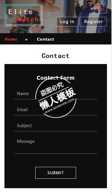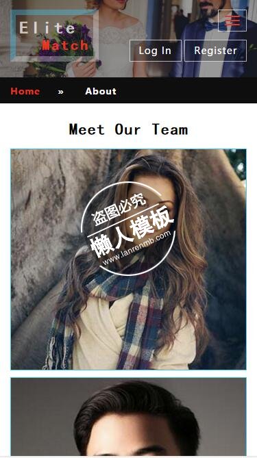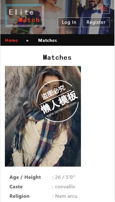 模板简介:该模板名称为【Elite Match走进婚姻殿堂html5手机wap社区交交网站模板免费下载】,大小是,文档格式为.,推荐使用打开,作品中的图片,文字等数据均可修改,图片请在作品中选中图片替换即可,文字修改直接点击文字修改即可,您也可以新增或修改作品中的内容,该模板来自用户分享,如有侵权行为请联系网站客服处理。欢迎来懒人模板【社区】栏目查找您需要的精美模板。