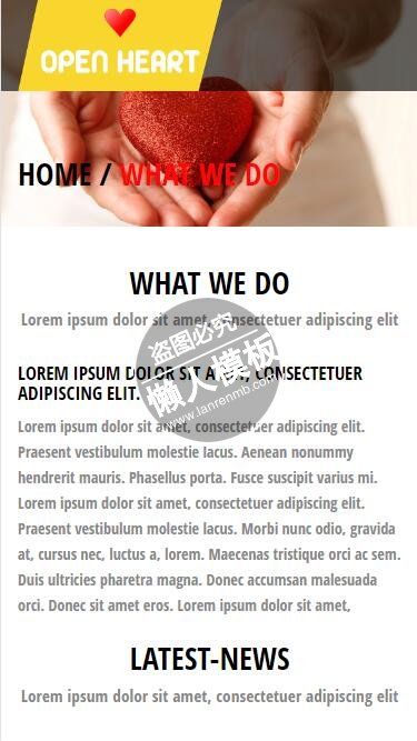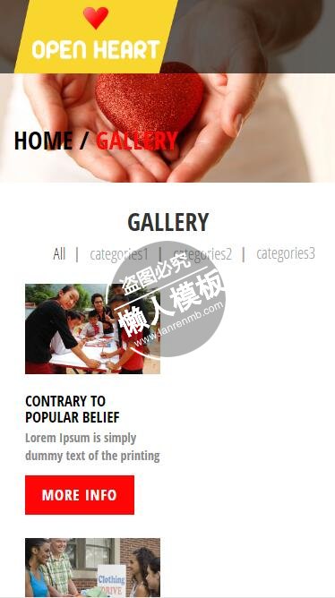 模板简介:该模板名称为【Open heart敞开心扉奉献爱心html5公益社交手机网站模板免费下载】,大小是,文档格式为.,推荐使用打开,作品中的图片,文字等数据均可修改,图片请在作品中选中图片替换即可,文字修改直接点击文字修改即可,您也可以新增或修改作品中的内容,该模板来自用户分享,如有侵权行为请联系网站客服处理。欢迎来懒人模板【社区】栏目查找您需要的精美模板。