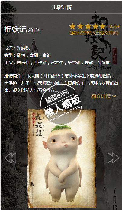 模板简介:该模板名称为【私人影咖在线影院触屏版自适应手机wap视频网站模板下载】,大小是,文档格式为.,推荐使用打开,作品中的图片,文字等数据均可修改,图片请在作品中选中图片替换即可,文字修改直接点击文字修改即可,您也可以新增或修改作品中的内容,该模板来自用户分享,如有侵权行为请联系网站客服处理。欢迎来懒人模板【视频】栏目查找您需要的精美模板。