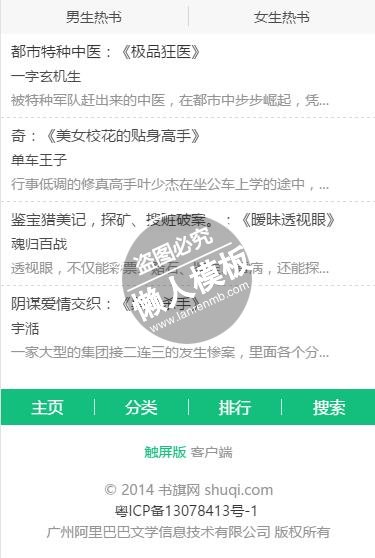 模板简介:该模板名称为【书旗小说网触屏版自适应手机wap小说网站模板下载】,大小是,文档格式为.,推荐使用打开,作品中的图片,文字等数据均可修改,图片请在作品中选中图片替换即可,文字修改直接点击文字修改即可,您也可以新增或修改作品中的内容,该模板来自用户分享,如有侵权行为请联系网站客服处理。欢迎来懒人模板【小说】栏目查找您需要的精美模板。