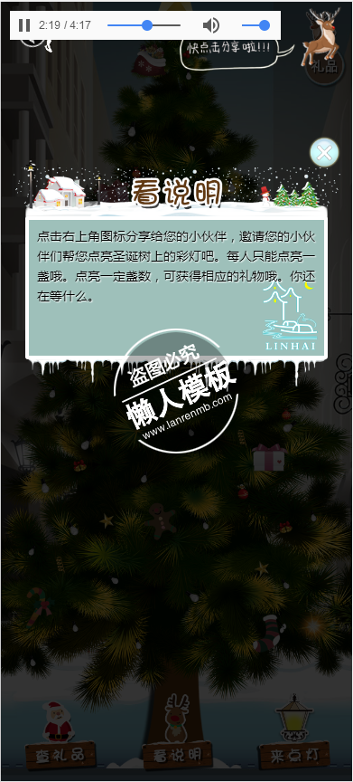 模板简介:该模板名称为【圣诞点灯游戏活动单页html5手机专题单页网站模板源码下载】,大小是,文档格式为.,推荐使用打开,作品中的图片,文字等数据均可修改,图片请在作品中选中图片替换即可,文字修改直接点击文字修改即可,您也可以新增或修改作品中的内容,该模板来自用户分享,如有侵权行为请联系网站客服处理。欢迎来懒人模板【娱乐】栏目查找您需要的精美模板。