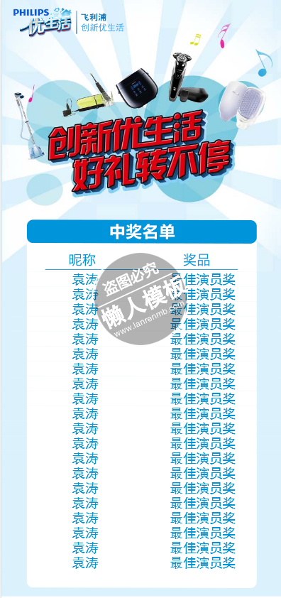 模板简介:该模板名称为【创新生活赢好礼活动页面html5手机专题单页网站模板源码下载】,大小是,文档格式为.,推荐使用打开,作品中的图片,文字等数据均可修改,图片请在作品中选中图片替换即可,文字修改直接点击文字修改即可,您也可以新增或修改作品中的内容,该模板来自用户分享,如有侵权行为请联系网站客服处理。欢迎来懒人模板【娱乐】栏目查找您需要的精美模板。