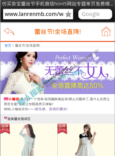 模板简介:该模板名称为【仿买卖宝蕾丝节手机微信html5网站专题单页免费模板源码下载】,大小是,文档格式为.,推荐使用打开,作品中的图片,文字等数据均可修改,图片请在作品中选中图片替换即可,文字修改直接点击文字修改即可,您也可以新增或修改作品中的内容,该模板来自用户分享,如有侵权行为请联系网站客服处理。欢迎来懒人模板【专题单页】栏目查找您需要的精美模板。