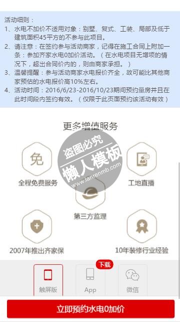 模板简介:该模板名称为【齐家水电项目不加价手机专题单页海报制作免费素材模板源码下载】,大小是,文档格式为.,推荐使用打开,作品中的图片,文字等数据均可修改,图片请在作品中选中图片替换即可,文字修改直接点击文字修改即可,您也可以新增或修改作品中的内容,该模板来自用户分享,如有侵权行为请联系网站客服处理。欢迎来懒人模板【专题单页】栏目查找您需要的精美模板。