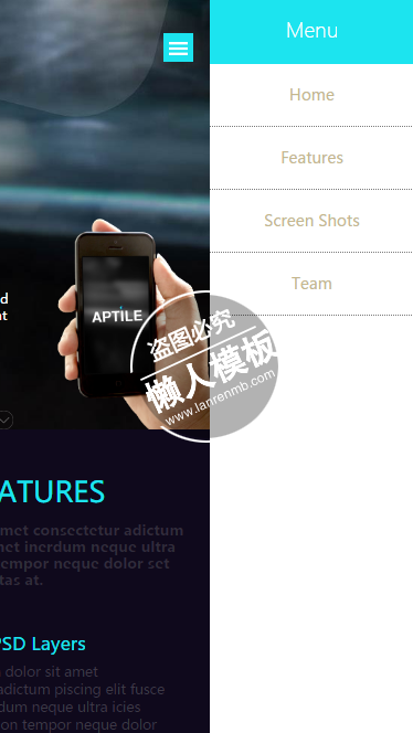 模板简介:该模板名称为【Aptile黑色商务站html5手机专题单页网站模板源码下载】,大小是,文档格式为.,推荐使用打开,作品中的图片,文字等数据均可修改,图片请在作品中选中图片替换即可,文字修改直接点击文字修改即可,您也可以新增或修改作品中的内容,该模板来自用户分享,如有侵权行为请联系网站客服处理。欢迎来懒人模板【专题单页】栏目查找您需要的精美模板。