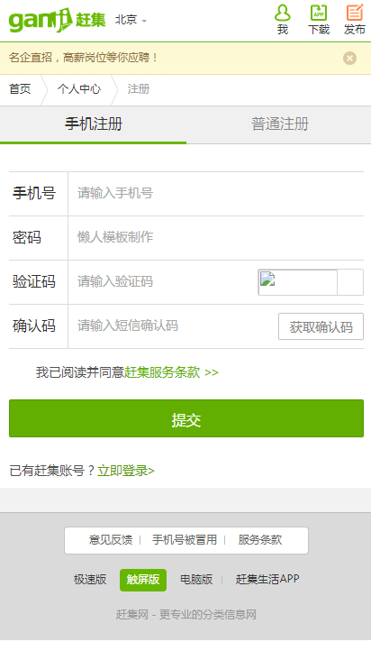 模板简介:该模板名称为【仿北京赶集网登录注册界面源代码模板下载!】,大小是,文档格式为.,推荐使用打开,作品中的图片,文字等数据均可修改,图片请在作品中选中图片替换即可,文字修改直接点击文字修改即可,您也可以新增或修改作品中的内容,该模板来自用户分享,如有侵权行为请联系网站客服处理。欢迎来懒人模板【登录】栏目查找您需要的精美模板。